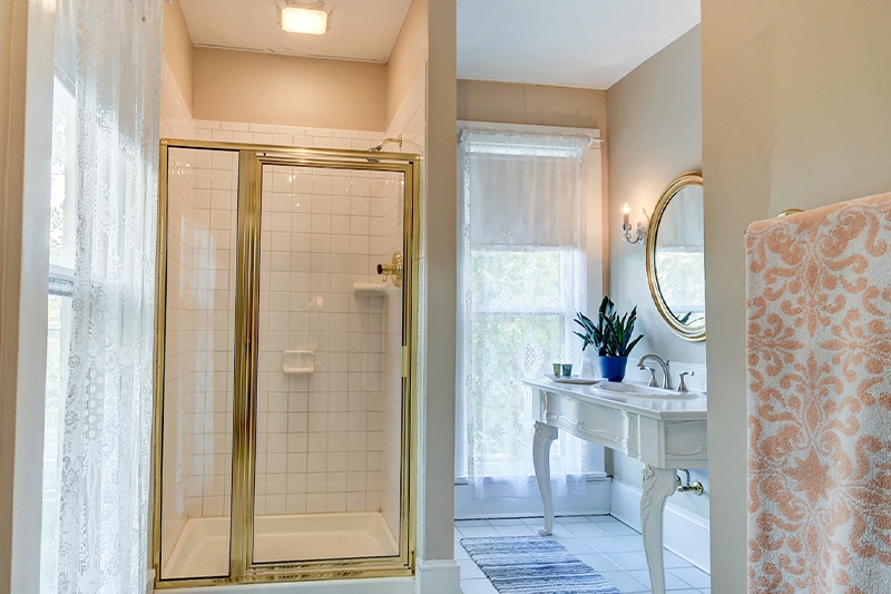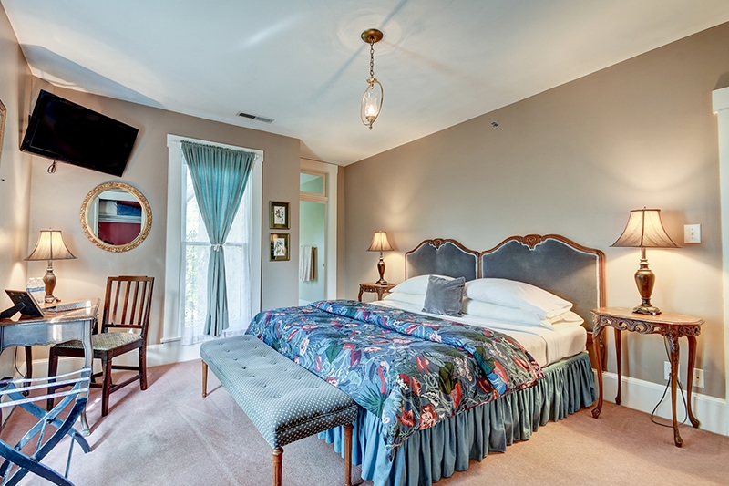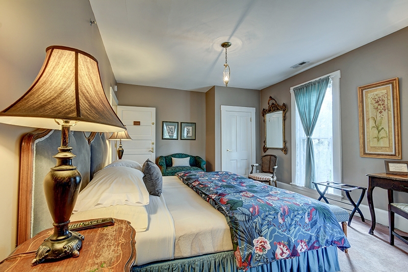 The beige lavender walls radiate different hues throughout the day in this second-level suite, and as the sun sets wonderful rays enter the Caldwell. The king bed is accentuated with a plush velvet headboard and comfortable furnishings.